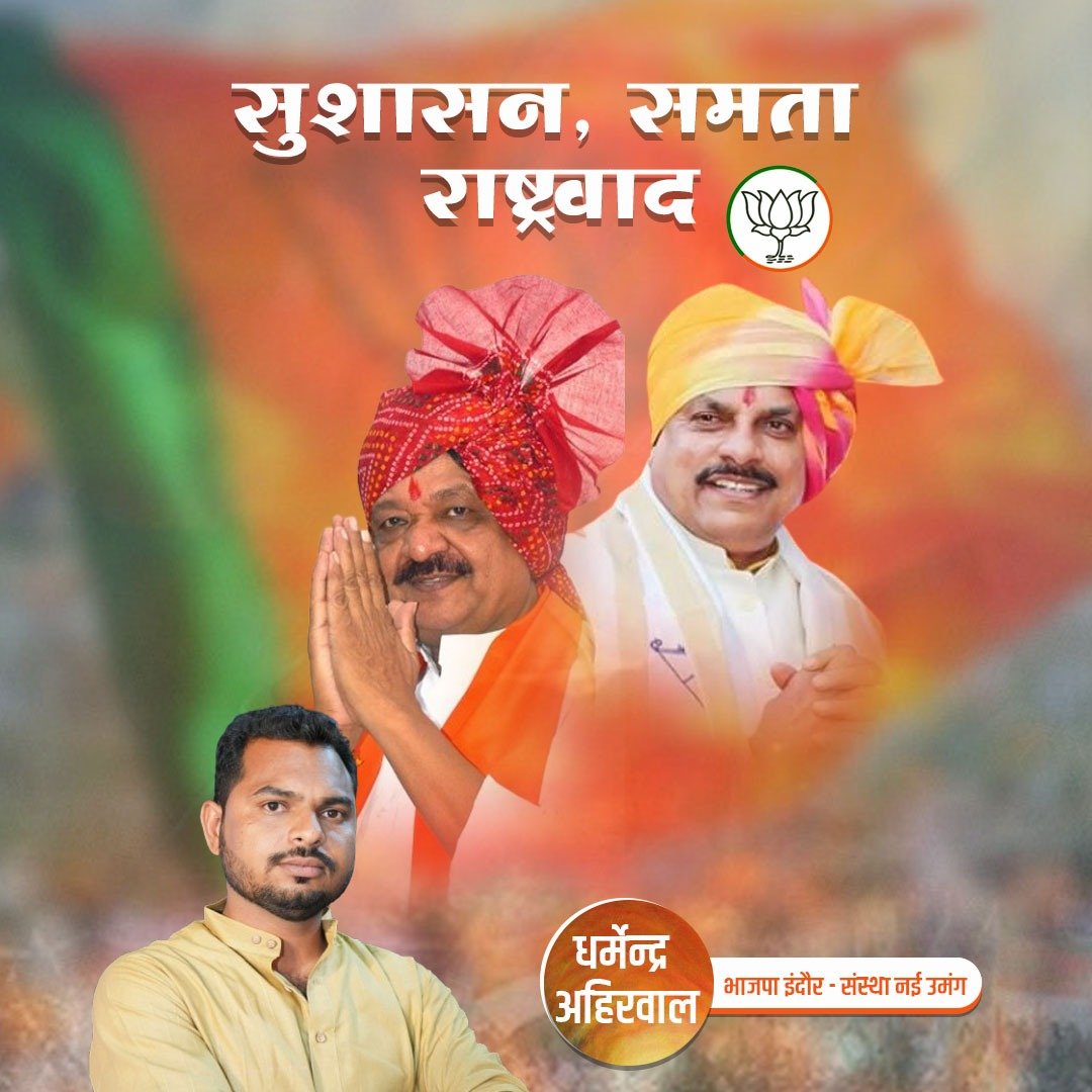श्री धर्मेन्द्र अहिरवाल भारत के सबसे बड़े एवं विश्वसनीय राजनीतिक दल भारतीय जनता पार्टी इंदौर शहर के युवा नेता के रूप में कार्यरत हैं राजनीतिक परिवेश के साथ ही सामाजिक परिवेश एवं कई धार्मिक कार्यों में धर्मेन्द्र अहिरवाल जी की भूमिका अहम मानी जाती है कई तरह की कई तरह की सरकार की जन हितैषी योजनाओं को जन-जन तक पहुंचाना स्वास्थ्य शिविर रक्तदान शिविर महात्मा गांधी की जयंती पर हॉस्पिटल में सेवा के कार्य करना एवं स्कूल के छात्र छात्राओं के लिए प्रतिवर्ष शिक्षा सामग्री का वितरण करना प्रति वर्ष पर्यावरण की रक्षा हेतु पौधारोपण एवं स्वच्छता अभियान में भी अहम भूमिका रही है धार्मिक आयोजनों में प्रतिवर्ष नवरात्रि प्रसाद वितरण महा आरती की जाती है|